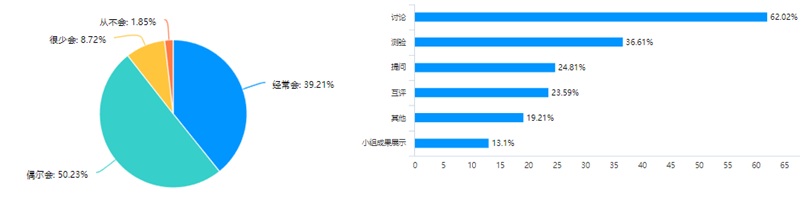 39.21%的学生认为教师经常会进行课程教学互动;50.32%的学生认为教师偶尔会进行课程教学互动;10%的学生认为教师很少或从不会进行教学互动,说明教师的教学互动设计还有待加强。在教师使用的互动教学方式方面:62.02%学生认为通过讨论可以获得较大收获;36.61%的学生认为测验、提问和互评可以提升教学互动效果,建议教师在课程设计中有机融入提升互动效果的有效途径。