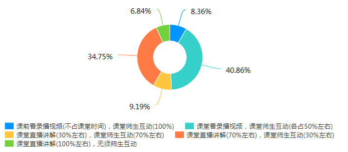 如图13所示,课堂教学组织形式的选择:40.86%的学生认为【课堂看录播视频+课堂师生互动(各占50%左右)】较好;34.75%的学生认为【课堂直播讲解(70%左右)+课堂师生互动(30%左右)】较好;9.19%的学生认为【课堂直播讲解(30%左右)+课堂师生互动(70%左右)】较好;8.36%的学生认为【课前看录播视频(不占课堂时间)+课堂师生互动(100%)】较好;6.84%的学生认为【课堂直播讲解(100%)+无须师生互动】较好。结果显示大多数学生喜欢“录播视频+师生互动”“直播讲解+师生互动”,说明学生还是比较重视教学互动,希望参与融入课堂教学的主动性和积极性较高,同时教师选用的教学资源也较为关键,学生希望通过录播视频可以完成预习和复习。