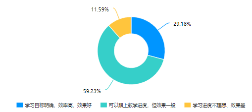 29.18%的学生认为自己的学习目标明确、效率高、效果好;59.23%的学生认为可以跟上教学进度,说明有88.41%的学生认可线上教学效果。11.59%的学生认为学习效果不佳,存在在线教学无法满足学习需要和无法有效掌握教师讲授内容的问题,说明在教学整体效果较好的基础上,仍要求任课教师对班级排名后10%的同学给予更多关注,加强课后辅导答疑,以提升学生的在线学习效果。
