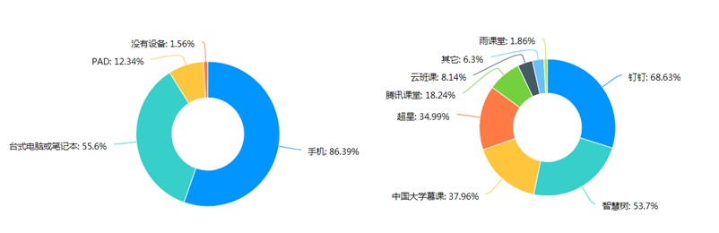 3月2日开课以来,约86.39%的学生使用手机在线学习;约55.6%的学生使用电脑在线学习;调查中显示约1.56%的学生没有学习设备,后期学校和学院应核实跟进相关信息,帮扶确有困难同学解决在线学习的网络费用和学习设备。