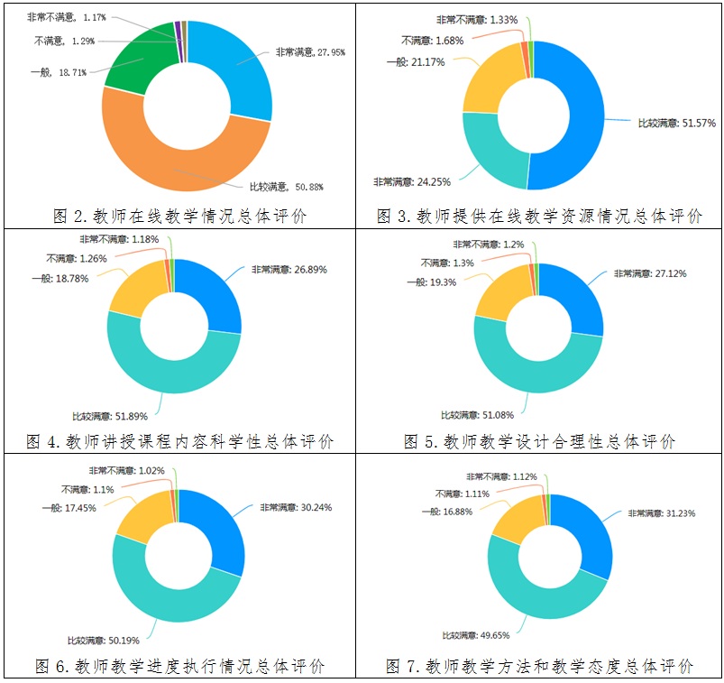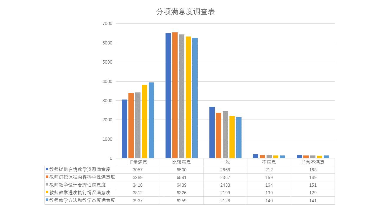 从教师提供在线教学资源情况、课程内容科学性、教学设计合理性、教学进度执行情况和教学方法态度5个分项调查学生满意度,见图3-7。由汇总数据图8可以看出,在各分项指标中学生对教学方法和教学态度、教学进度执行情况的满意率为97%,说明教师能够按照教学进度开展教学工作,且教学方法得当,教学态度较好;教学设计合理性、课程内容科学性满意率达到96.5%;在线教学资源提供情况总体评价满意度为96%,说明在线教学资源的数量及质量有力支持了线上教学的开展。
