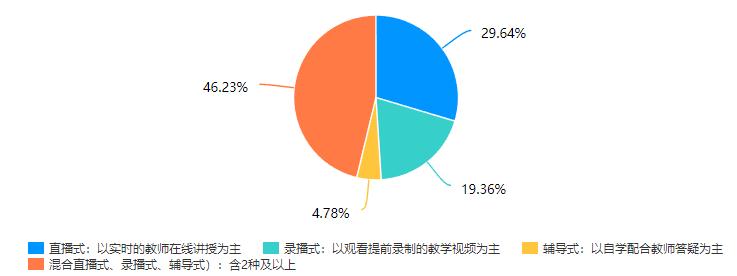 学生喜欢的线上教学模式:46.23%的学生选择混合式(直播式/录播式/辅导式2种形式以上);29.64%的学生选择直播式(以实时的教师在线讲授为主);19.36%的学生选择录播式(以观看提前录制的教学视频为主);4.78%的学生选择辅导式(以自学配合教师答疑为主)。结果显示学生更喜欢有学习体验的线上教学形式,如直播式、混合式等,对无学习体验的自主学习加答疑的线上教学形式反映一般。