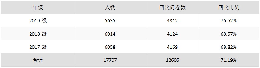 本次问卷调查学生参与踊跃,各学院、各年级参与人数见图1、表1。