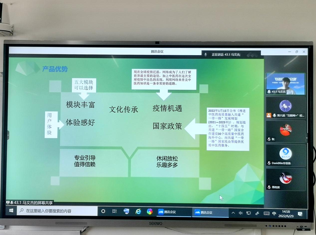 哈尔滨商业大学第八届中国国际“互联网+”大学生创新创业大赛黑龙江赛区校内选拔赛于2022年6月29日成功举办。选拔赛聘请东北石油大学一带一路与中蒙俄合作研究院院长宋要武教授、黑龙江大学创业教育学院副院长刘玉峰副教授、佳木斯大学创新创业学院院长邢传波副教授、东北石油大学创新创业学院院长耿岱教授、赛云九洲科技股份有限公司董事长辛世伟等12名教育部首批全国万名优秀创新创业导师组成评审专家。哈尔滨商业大学副校长王巍教授热烈欢迎评审专家为我校参赛项目把关掌舵,对团队给予建设性指导,为省赛选出好项目、好苗子,给予团队建设性指导,取得更好成绩。