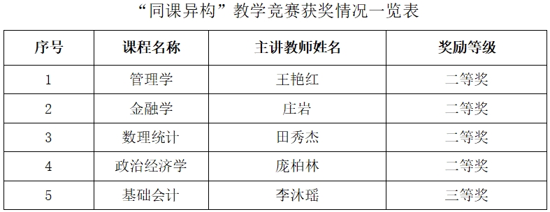 近日,由中国高校财经慕课联盟主办,东北财经大学、上海财经大学、西南财经大学、中南财经政法大学和中央财经大学共同承办的“同课异构”教学竞赛正式举行。本届“同课异构”教学竞赛以“课程思政”为主题,参赛课程为管理学、基础会计、金融学、政治经济学、数理统计五门专业必修课,学校选派了5名教师参加比赛,共获得二等奖4项、三等奖1项的佳绩。