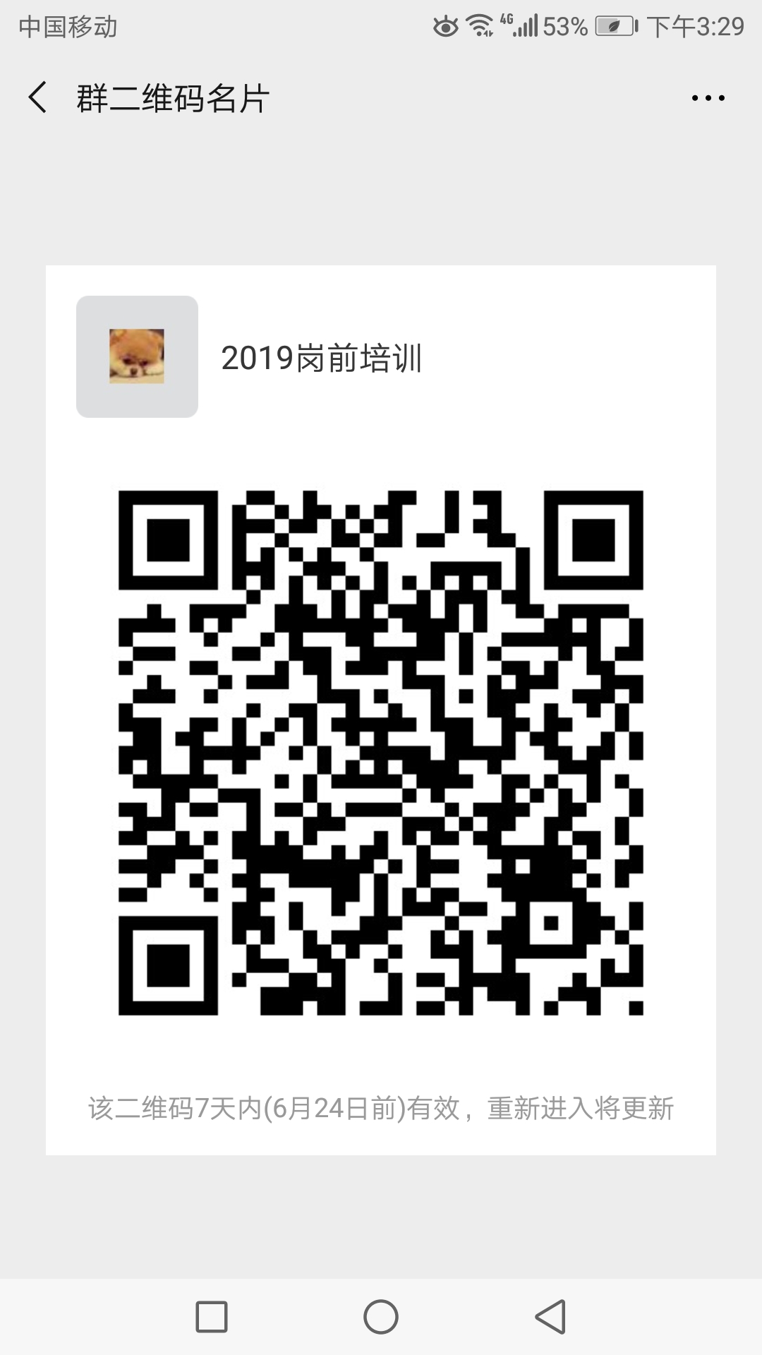 参训学员必须扫码进入微信群:2019岗前培训。二维码如右侧所示,图片大小可调。