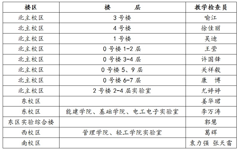 校级教学检查工作组成员深入教学现场检查教师授课和学生上课情况,检查内容包括:(1)任课教师、学生按时上下课和出勤情况;(2)多媒体课件质量及使用效果;(3)实践教学环节。要求对所负责楼层和实验室进行全天检查,每天认真填写教学秩序检查表。任务分配如下: